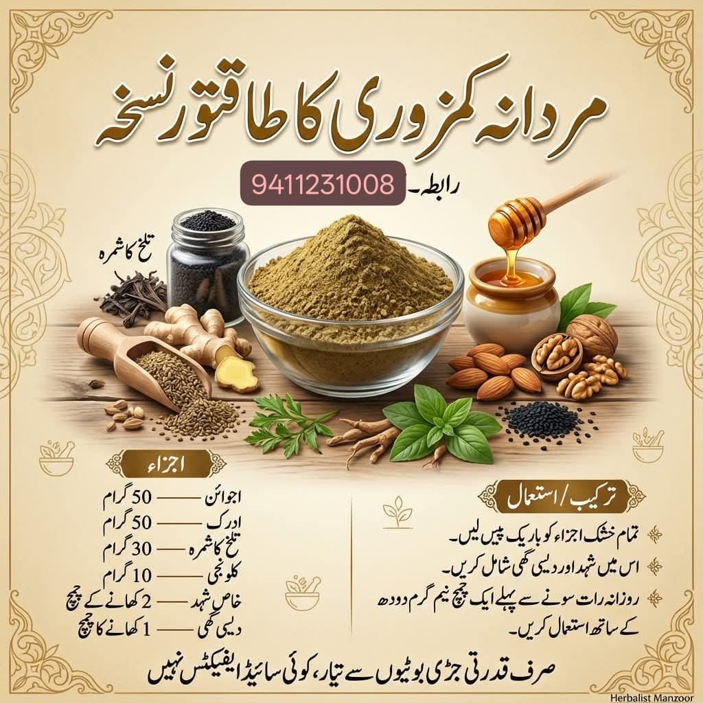 ЁЯМ┐ Natural Remedy for Male Weakness Male weakness has become a common problem in todayтАЩs fast-paced life, often caused by stress, poor diet, and fatigue. This Ayurvedic herbal formula helps improve physical strength, stamina, and energy in men. With regular use, the body becomes stronger, blood circulation improves, and confidence increases. Being completely natural, safe, and free from side effects, this remedy supports menтАЩs health and vitality for the long term.